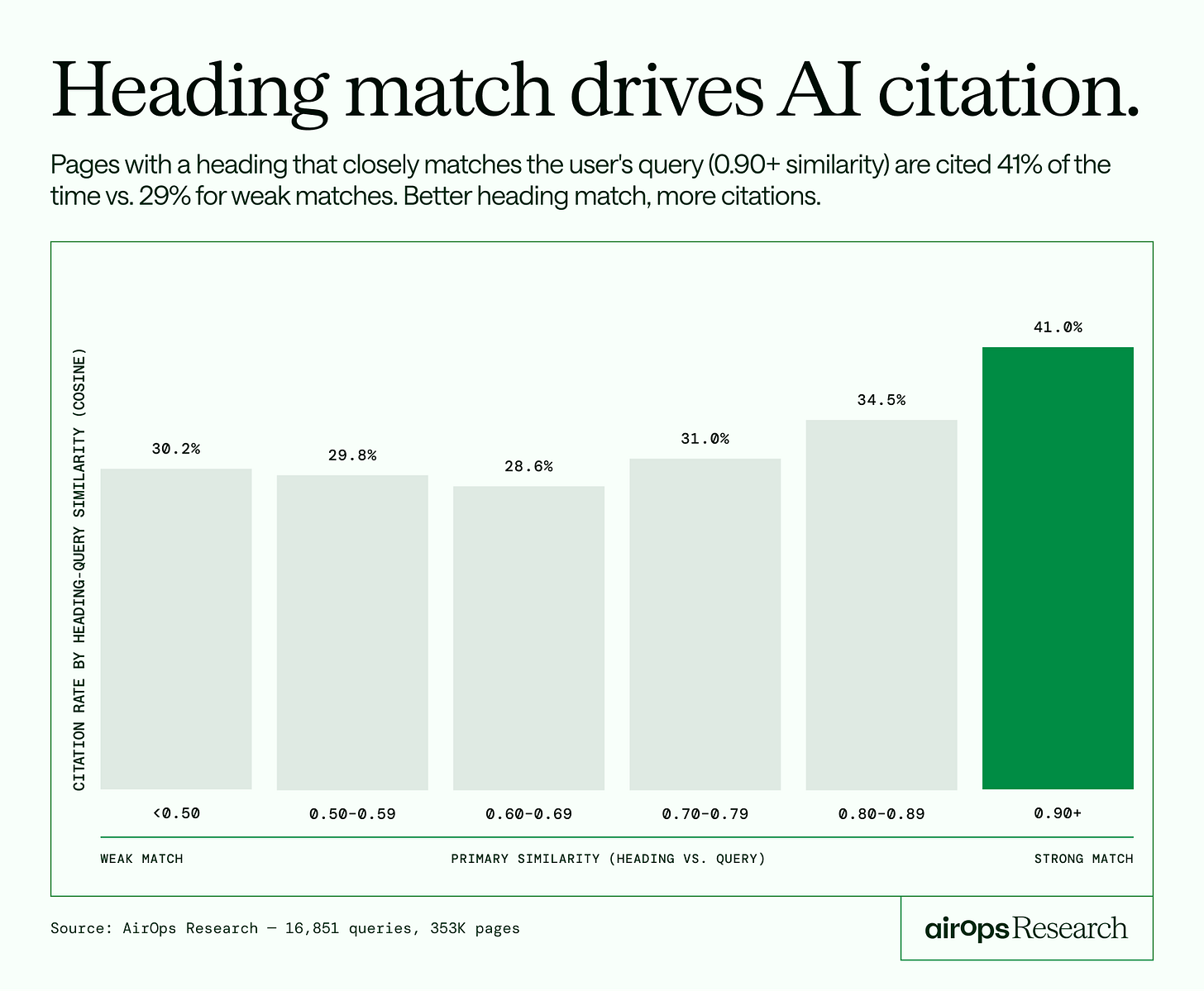 Pages with headlines that directly answer the query get cited 41% of the time. Loosely related headlines? 29%.