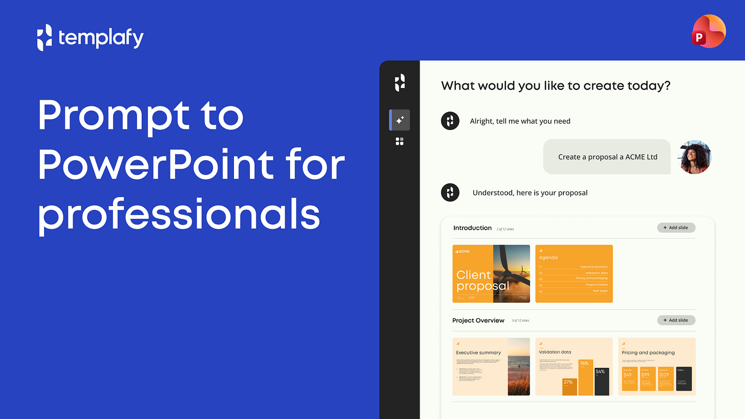Templafy works inside PowerPoint. You set the brand rules, approved assets, and content guardrails once. Every AI-generated deck your team builds after that follows them automatically.