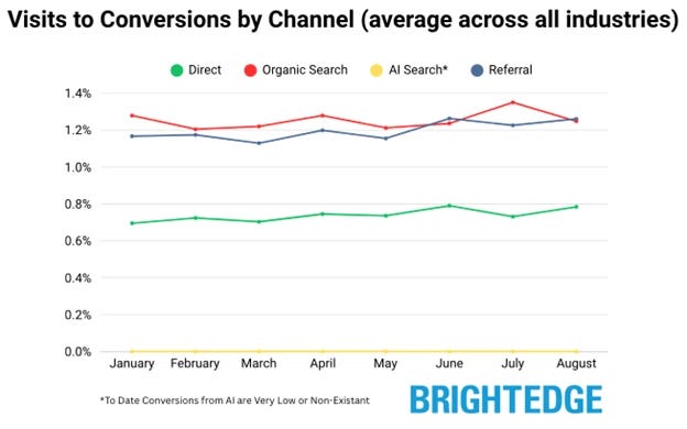 1. AI Search Traffic Remains Minimal - BrightEdge found that AI-driven search referrals accounted for less than 1% of total traffic from January to August, even with some platforms seeing triple-digit monthly growth. This means AI search currently drives little measurable sales or conversions despite all the hype.