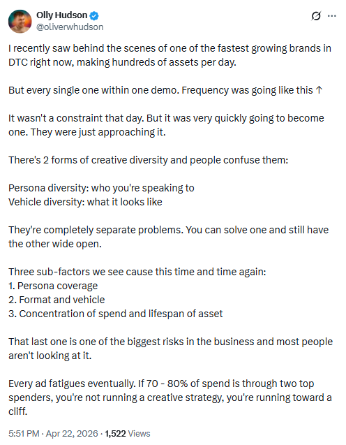 75% of performance marketers are reporting diminishing returns on social spend. Meta CPMs climbed 18% in 2025. The default response is to test more creative, restructure campaigns, and tighten audiences. That instinct is wrong, and here’s why.