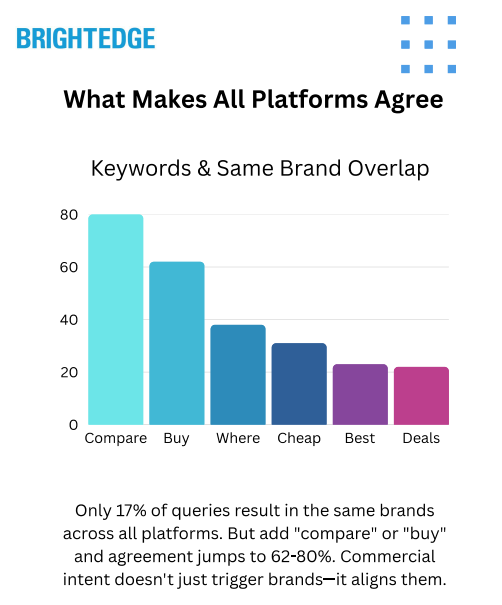 1. Platforms Rarely Agree on Brands - Across tens of thousands of prompts, ChatGPT and Google disagreed on brand recommendations nearly 62% of the time. Only 17% of queries surfaced the same brands across all three platforms.
