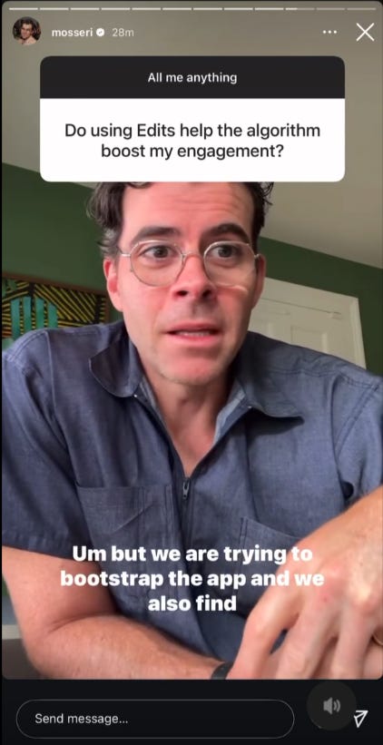 1. Edits App Videos Get a Temporary Reach Boost - Videos made in Meta’s “Edits” app currently get a small reach boost on Instagram. Adam Mosseri says this is a temporary move to grow awareness of the app, with IG able to detect if content is simply passed through without using Edits features.