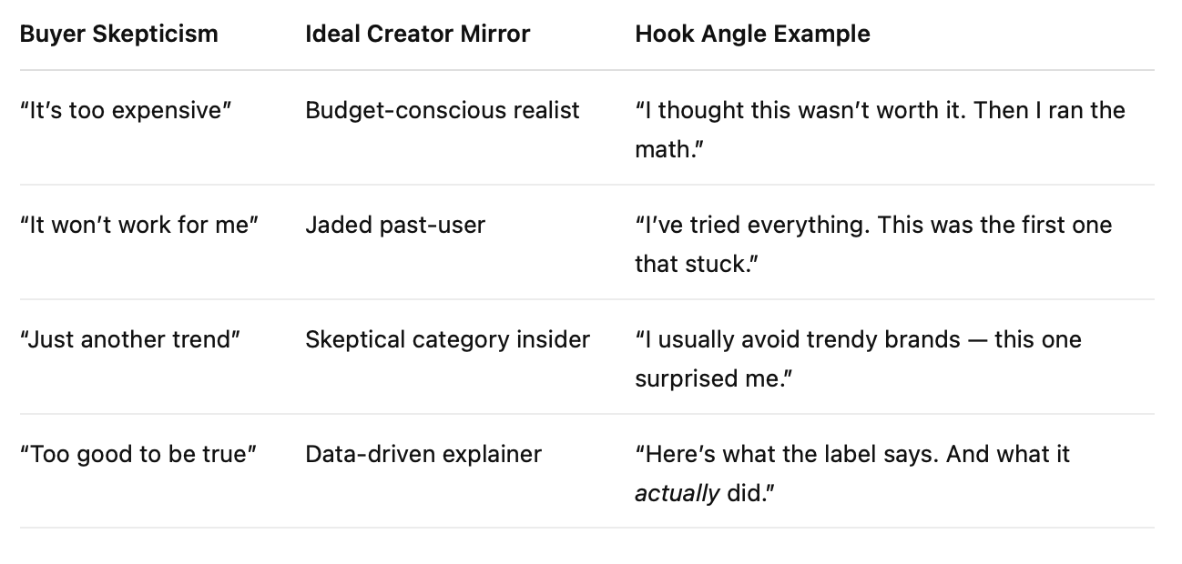 Most brands fumble at this moment. They send overly enthusiastic creators to convince the unconvinced and create friction instead of trust. To convert the reluctant, you need creators who mirror that reluctance.