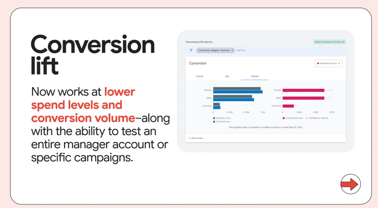 1️⃣ Conversion Lift Expansion - Advertisers can now run Conversion Lift tests at lower spend and volume, even across entire manager accounts, making it easier to gauge incremental lift from multiple campaign types without heavy budgets.