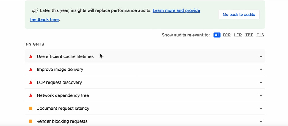 Insights Will Replace Diagnostics in the UI - A new âInsightsâ heading will house the updated audits, while legacy audits stay under âDiagnostics.â Starting with Lighthouse 12.6 in Chrome 137, users can preview both views. Lighthouse 13 (October 2025) will remove the old audits entirely.