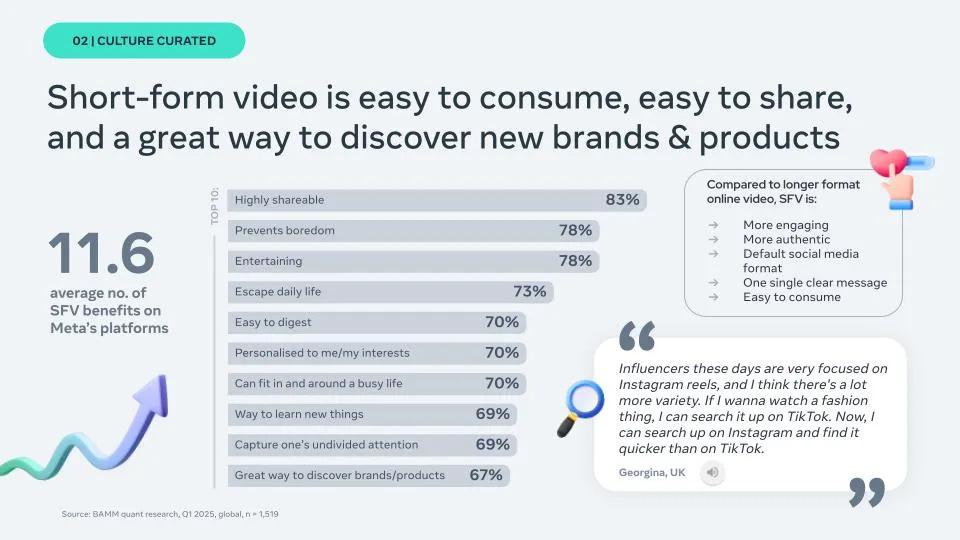 Gen Z makes up a third of the global population and is already influencing how culture and commerce evolve. Their habits are rooted in short-form video, curated content, and fluid app usage. Metaâs study across five countries reveals how brands can meet them where they are.