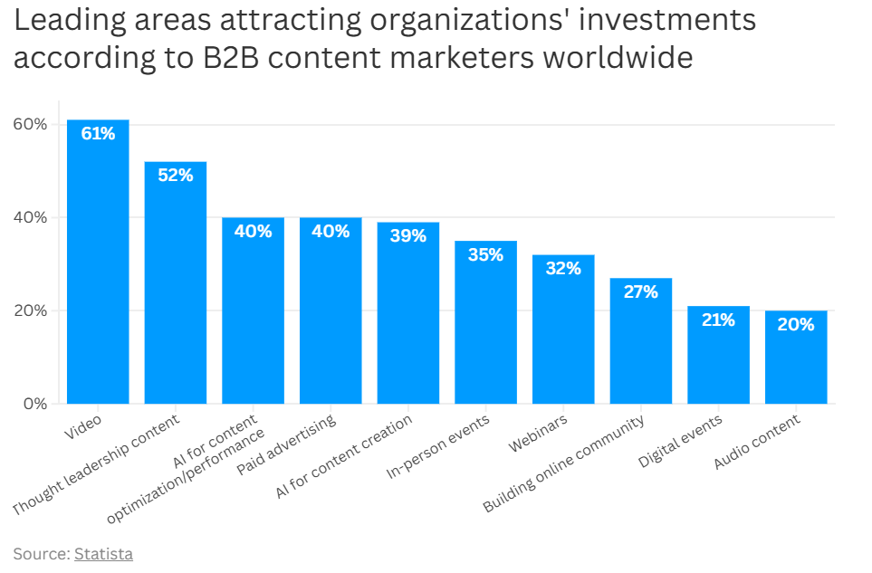 3. Video, AI, and Thought Leadership Lead - 61% of marketers are investing in video, followed by thought leadership (52%) and AI content optimization (40%). AI is also being used for content writing (42%), social content (40%), and SEO (32%).