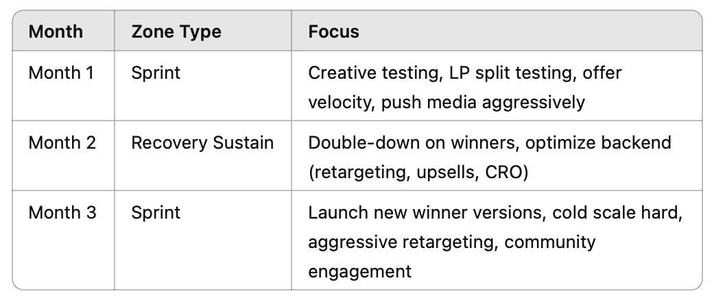 Sprints: Designed 2-3 week periods where ad testing, creative production, and offer pushes operate at maximum throughput.