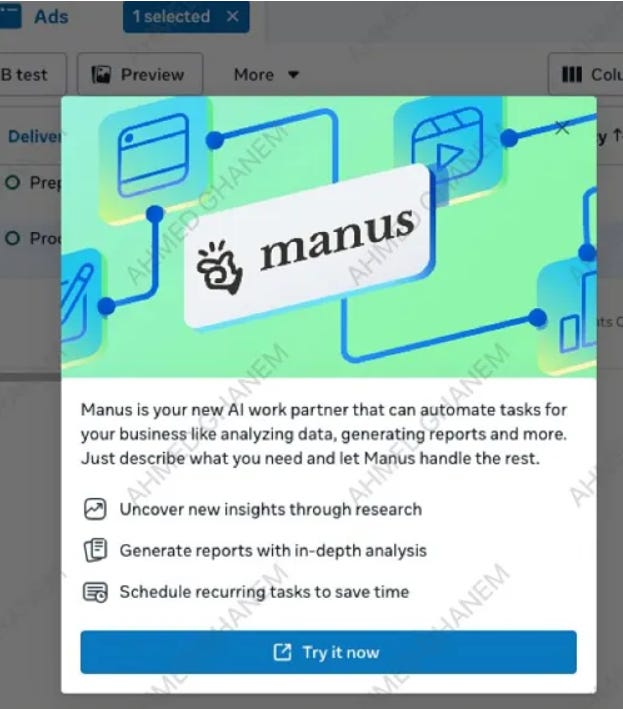 1. Meta Brings Manus Into Ads Manager - Manus AI is now accessible inside Ads Manager through the Tools section, with some advertisers seeing direct in-stream prompts. It supports reporting, audience research, and repetitive campaign tasks within a single workflow.