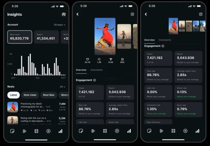 1. Upgraded insights & performance tracking - The refreshed analytics UI now lets creators toggle between different Reels clips and compare how each performed. Key metrics like top-performing categories are easier to spot, helping creators double down on what drives the most engagement.