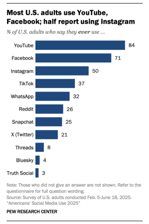 Pew Research surveyed 5,022 US adults to understand which social platforms people say they “ever use,” meaning they have used the app at any point. This measures overall reach rather than time spent or preference.