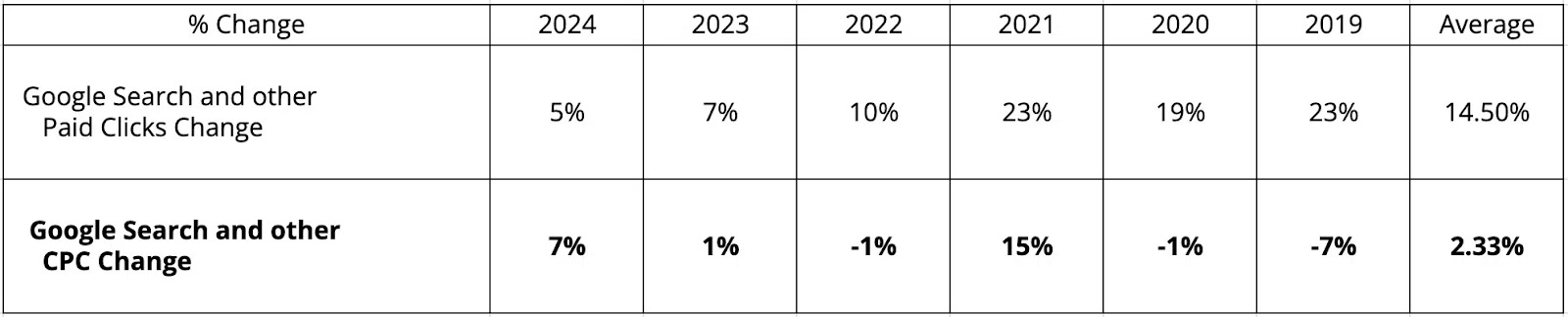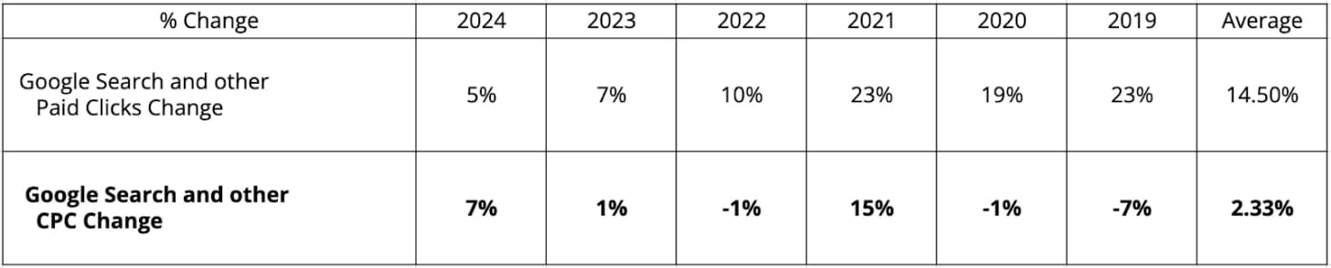 1. Googleâs Own Data Shows Modest Growth - According to Alphabetâs annual reports, CPCs grew only 2.33% per year between 2019â2024, suggesting manageable inflation. But these figures reflect global averages across platforms, which likely mask country-specific and industry-level spikes.