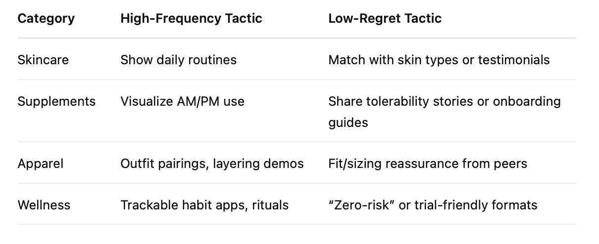 2. Reduce Outcome Uncertainty: Use testimonials or creator content to minimize doubt about efficacy, fit, or skin type.