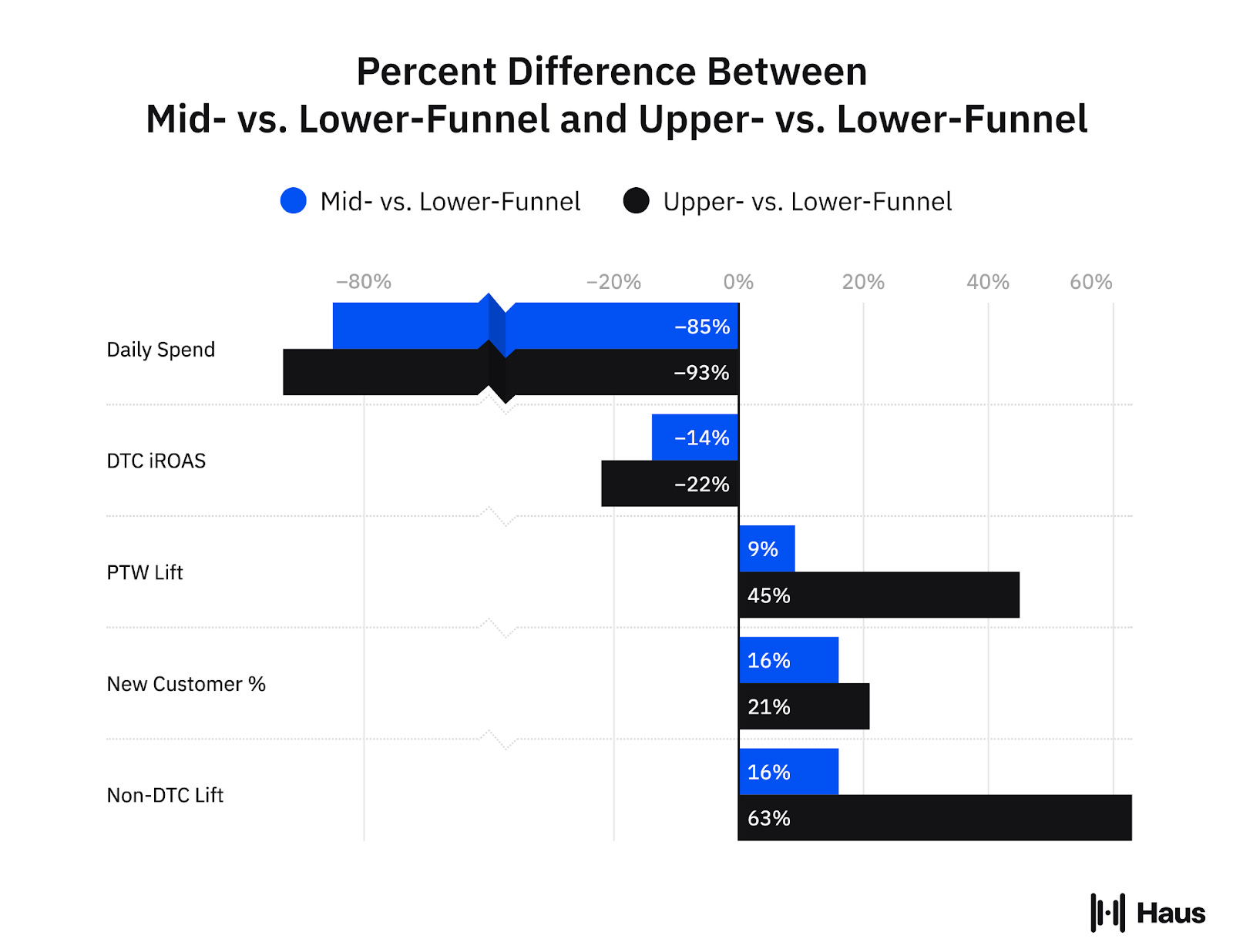3. Mid- & Upper-Funnel Tactics Unlock Halo Gains - Mid-funnel optimization tests grew +121%, showing lower immediate iROAS (-14%) but stronger long-term lift (+9% PTW) and higher new-customer rates (78%). Upper-funnel campaigns remain underused (6% spend) but drove the highest omnichannel halo (+138%) and 81% new customers.