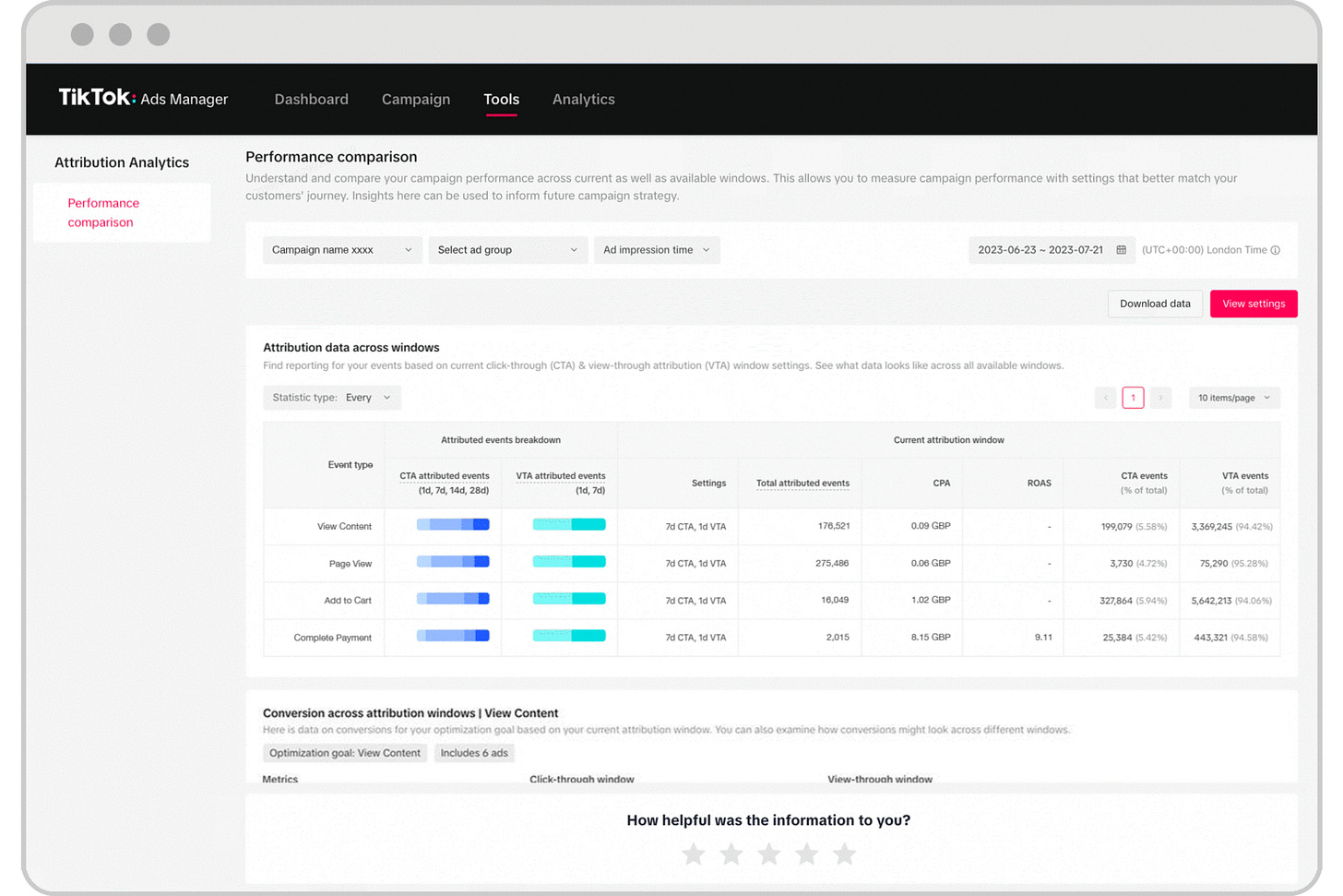 1️⃣ Attribution Analytics Maps the Full Journey - TikTok’s new Attribution Analytics provides full-funnel visibility, from awareness to purchase, using first-party data. The Performance Comparison tool helps brands analyze conversions under different attribution windows, evaluate click vs. view-through results, and uncover TikTok’s hidden impact beyond last-click metrics.