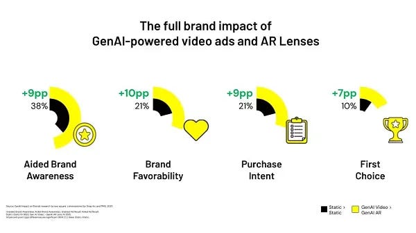 3. GenAI Boosts Brand Performance - AI-powered formats like video and AR Lenses drive big lifts compared to static ads: 75% of people want more product info, 72% visit brand websites, and 64% talk about the brand. These formats also improve key brand metrics, including +9pp in awareness, +10pp in favorability, and +9pp in purchase intent.