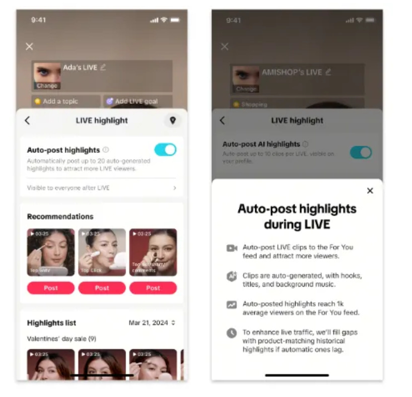 3. Live Streams Create Their Own Clips - A new Auto-post feature selects high-performing live-stream moments in real time and prepares them for publishing. Sellers can review and edit clips before they go live.