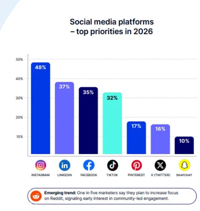 1. AI Integration - 82% of marketers now use AI, mainly for analytics (30%), content creation (28%), and ad targeting (26%). Only 35% report major productivity gains, signaling unrealized potential. Instagram (48 %) and LinkedIn (37%) remain the top AI-driven focus platforms.