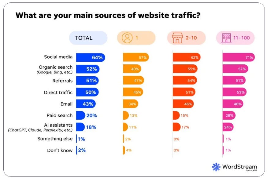 2. Social Outpaces SEO - Social media now drives more traffic than SEO (64% vs. 52%), aligning with consumer behavior where most product discovery happens on platforms like Instagram and TikTok. SMBs increasingly depend on social visibility, even using it as the primary alternative to having a website.