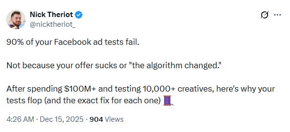 Build nine ads from the same product using three timestamps (morning, mid-day, night) and three ladders (annoyance, risk, identity). These are meaningfully different angles, not cosmetic variations. One usually becomes the account’s “gravity well.”