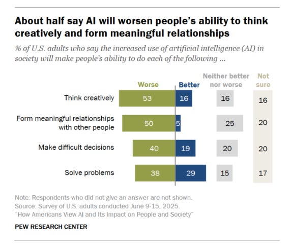 3. Younger Audiences Are More Aware - Awareness of AI is highest among adults under 30, with 62% saying they’ve heard a lot about it, compared to only 32% of those 65 and older. Yet younger adults are also more likely to believe AI will harm creative thinking and meaningful human relationships.