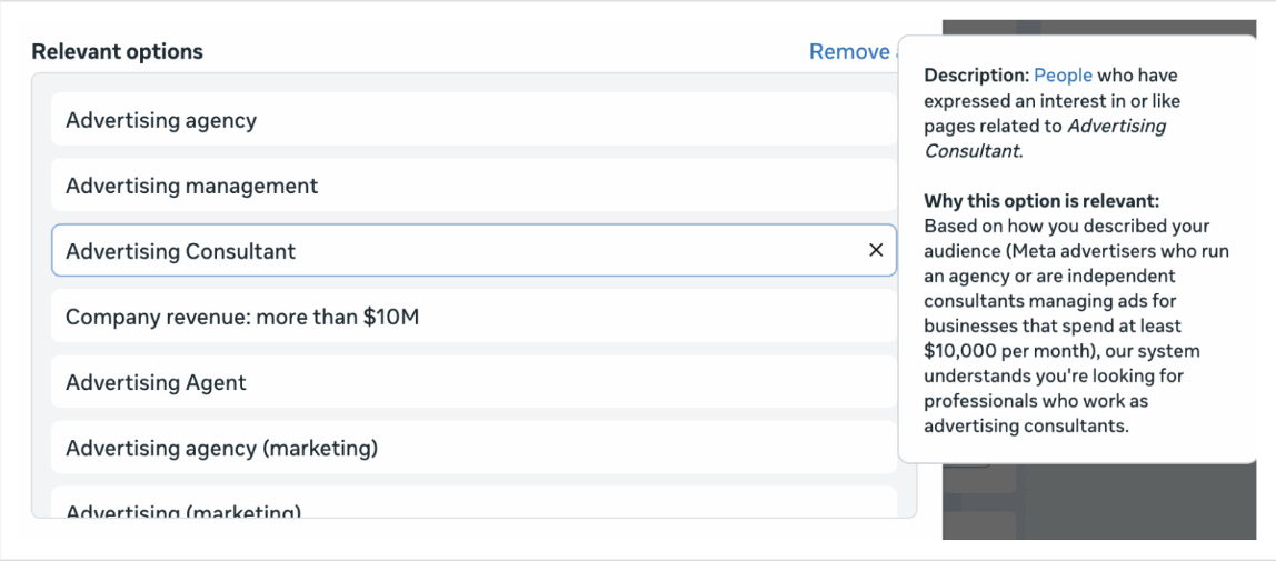 1. Describe Your Audience -A new Describe Your Audience feature lets you type up to 2,000 characters about your ideal customer, and Meta’s AI suggests matching interests and behaviours with reasoning for each, surfacing options you might never have found manually.